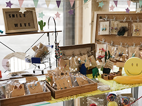 笑顔の波が押し寄せるようにみんな笑顔になってほしいという願いを込めて作られた雑貨やアクセサリー。